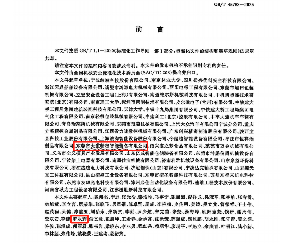 近日,東莞市大道精密智能裝備有限公司(以下簡稱“大道精密”)喜訊頻傳:公司作為文件起草單位參與制定的國家標準《GB/T 45783-2025 機械安全 安全防護授權系統 基本要求》正式發布,同時榮獲廣東省工業和信息化廳頒發的“專精特新中小企業”稱號。雙重榮譽不僅是對企業技術研發能力的高度認可,更彰顯了其在推動行業標準化進程和智能制造安全發展中的引領作用。