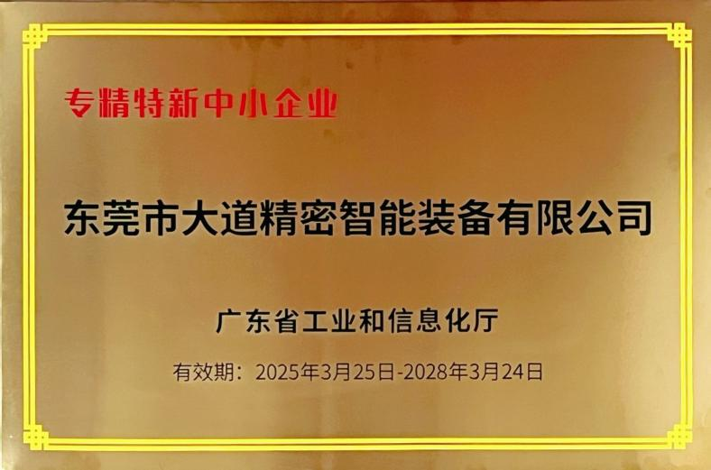 2024年12月19日,大道精密已被評定為廣東省“專精特新”中小企業。該資質認定聚焦于具備“專業化、精細化、特色化、新穎化”特征的中小企業,是對企業在細分市場技術優勢、創新能力及發展潛力的權威背書。大道精密長期深耕精密智能裝備研發,在自動化控制、安全防護系統集成等領域形成多項核心技術,產品廣泛應用于新能源、汽車制造、精密電子等行業,以高可靠性和智能化水平贏得市場口碑。